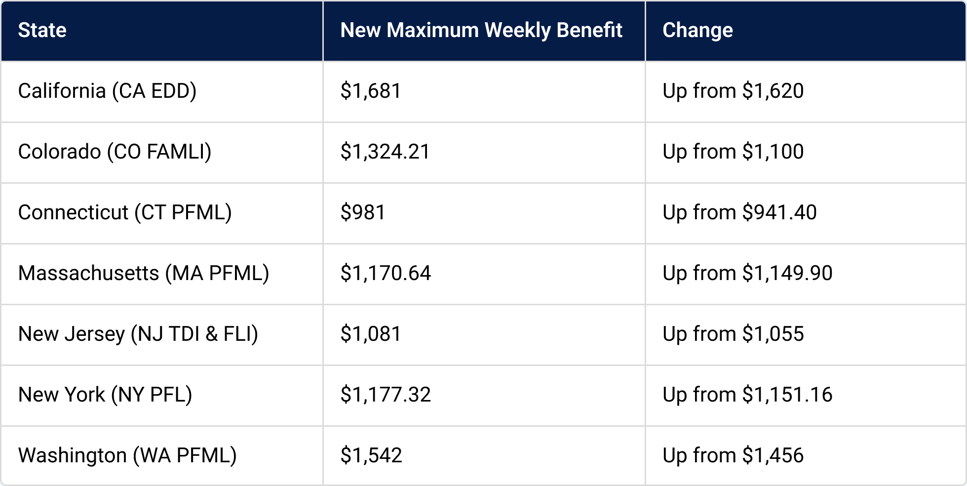 Several states with Paid Family and Medical Leave programs will implement new benefit calculations and increased maximum weekly benefits effective January 1, 2025. Here's a quick breakdown of the changes. |