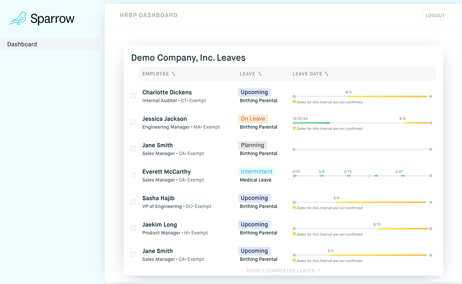 HR Business Partner (HRBP) Dashboard The HRBP Dashboard is now available to all Sparrow customers! This new feature gives HR Business Partners limited visibility into employee leaves and ensures they receive key email notifications, such as return-to-work reminders. Access is based on the HRBP field, which can be set manually or via an HRIS integration. We recommend enabling this feature alongside the Manager Dashboard, which provides managers with similar access while incorporating additional privacy safeguards and resources to help them support their teams. If you’d like to enable these features or learn more, please contact your Leave Specialist team. |